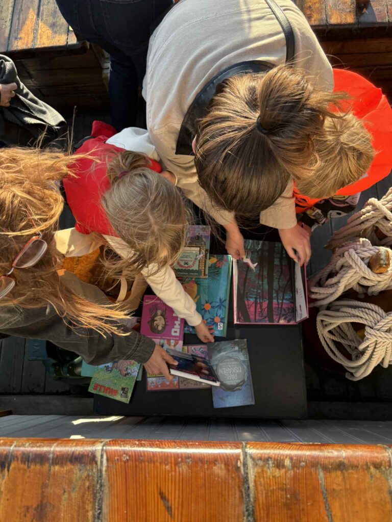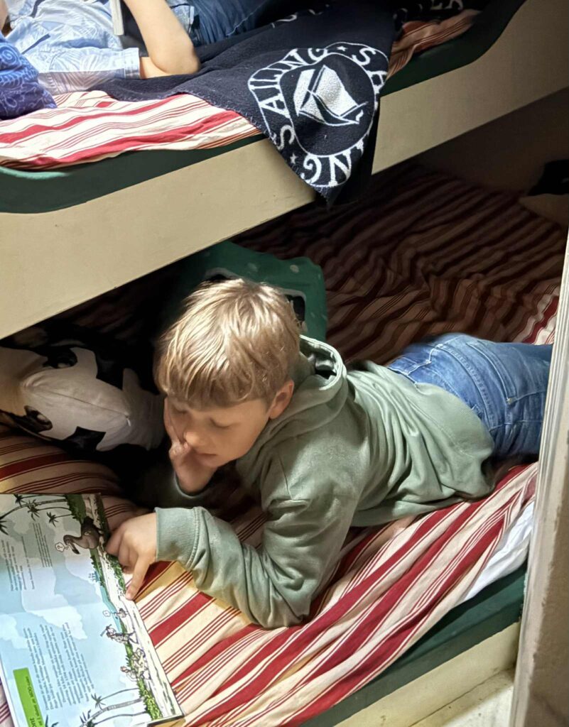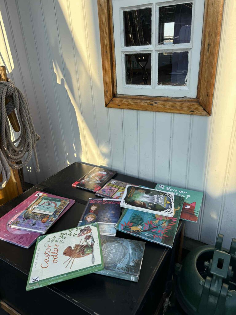 Barnen får läsa i kojer, på kajutatak och tillsammans med vuxna – en mysig kvällsaktivitet vid kaj som väcker nyfikenhet och stärker läslusten.